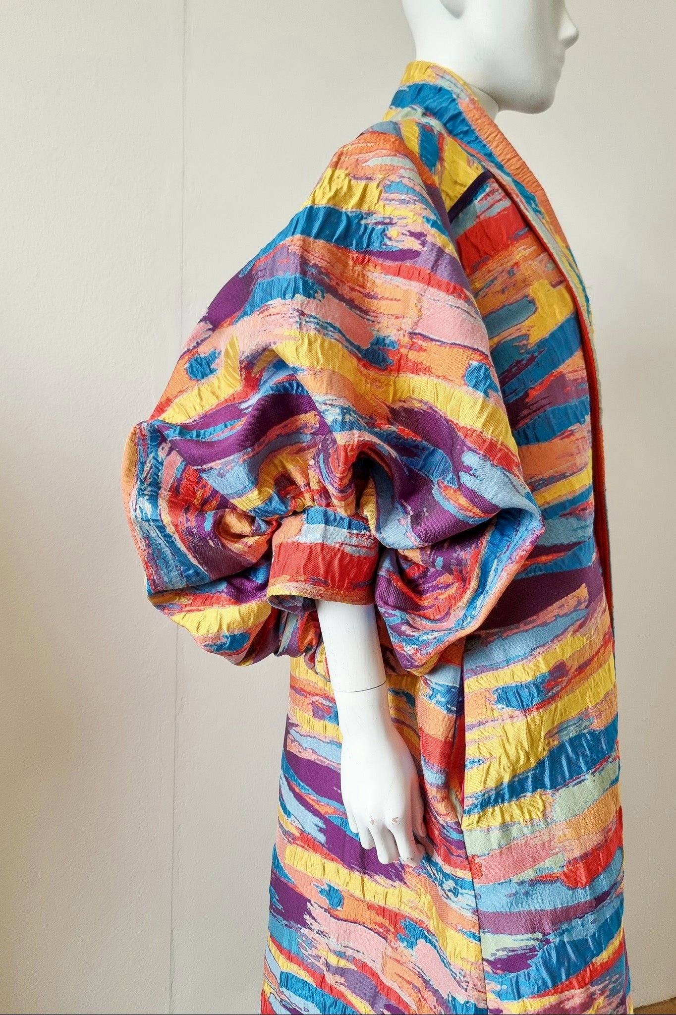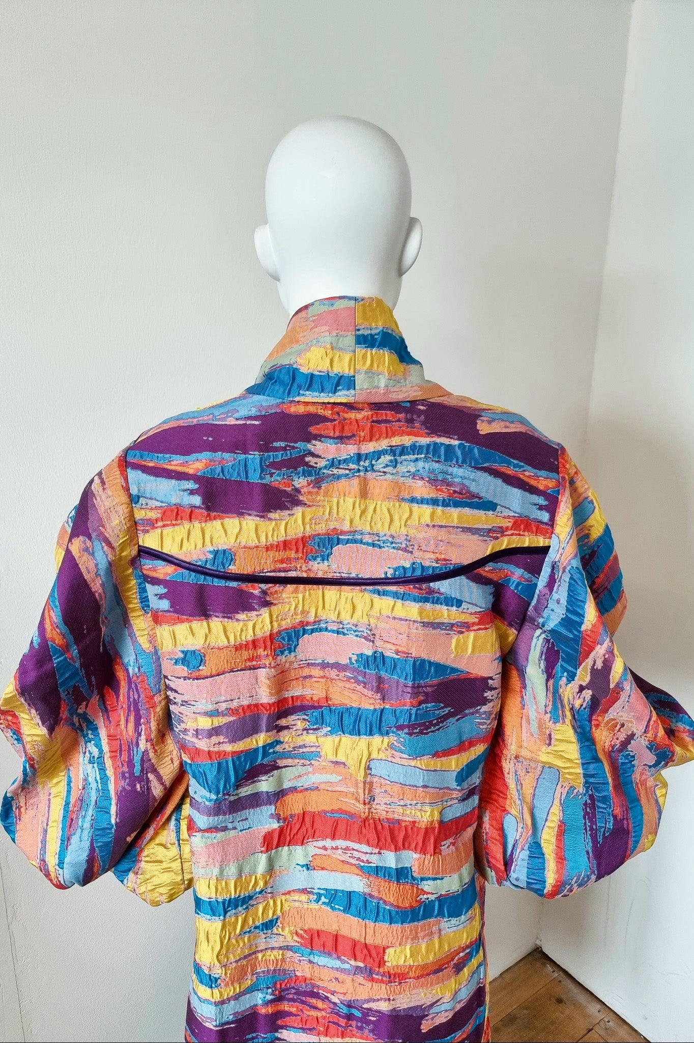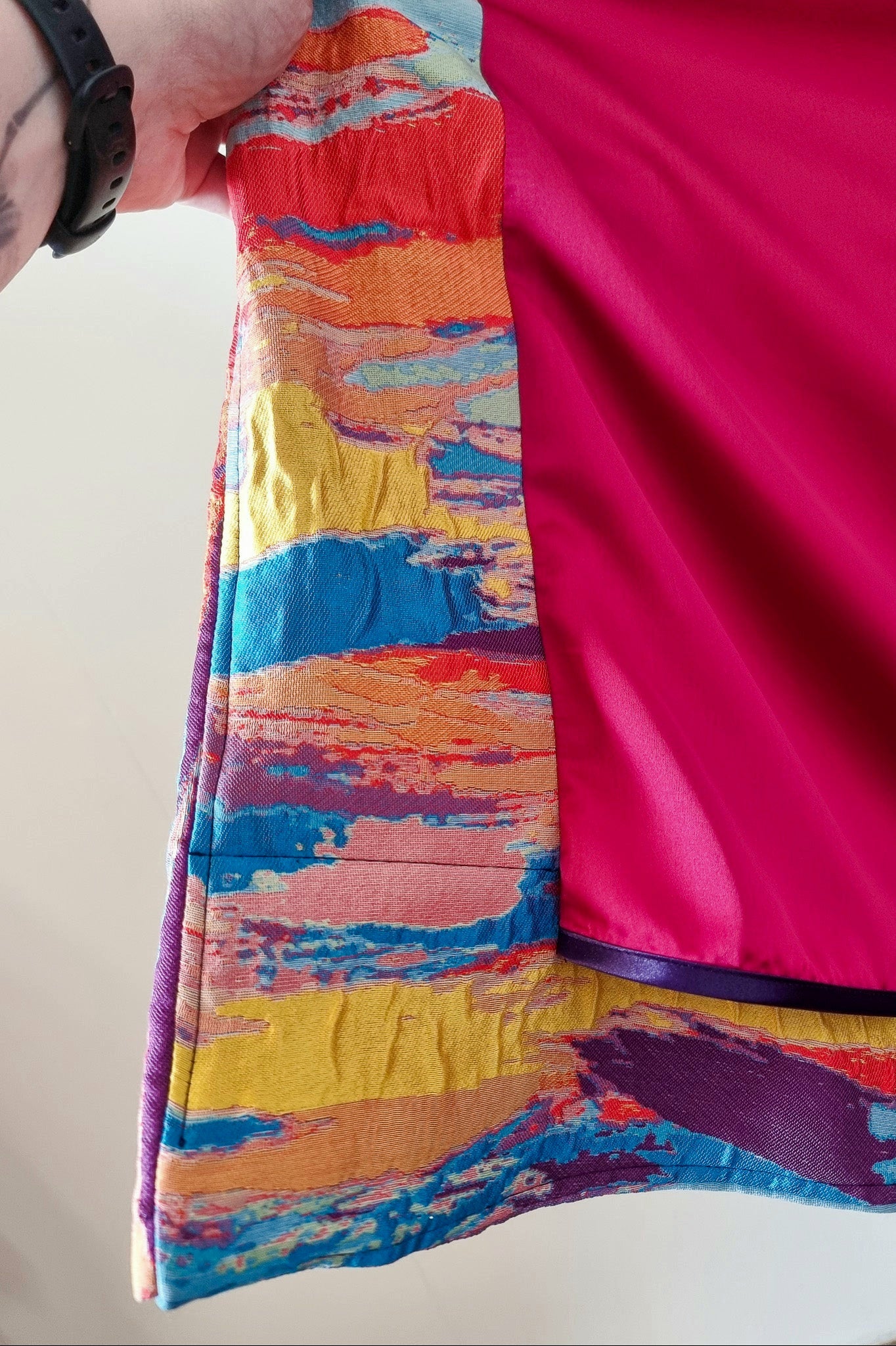 Fabric: One or our suppliers paint print brocades, lined in a slinky pink satin and the under collar has a bold orange contrast (polyester)