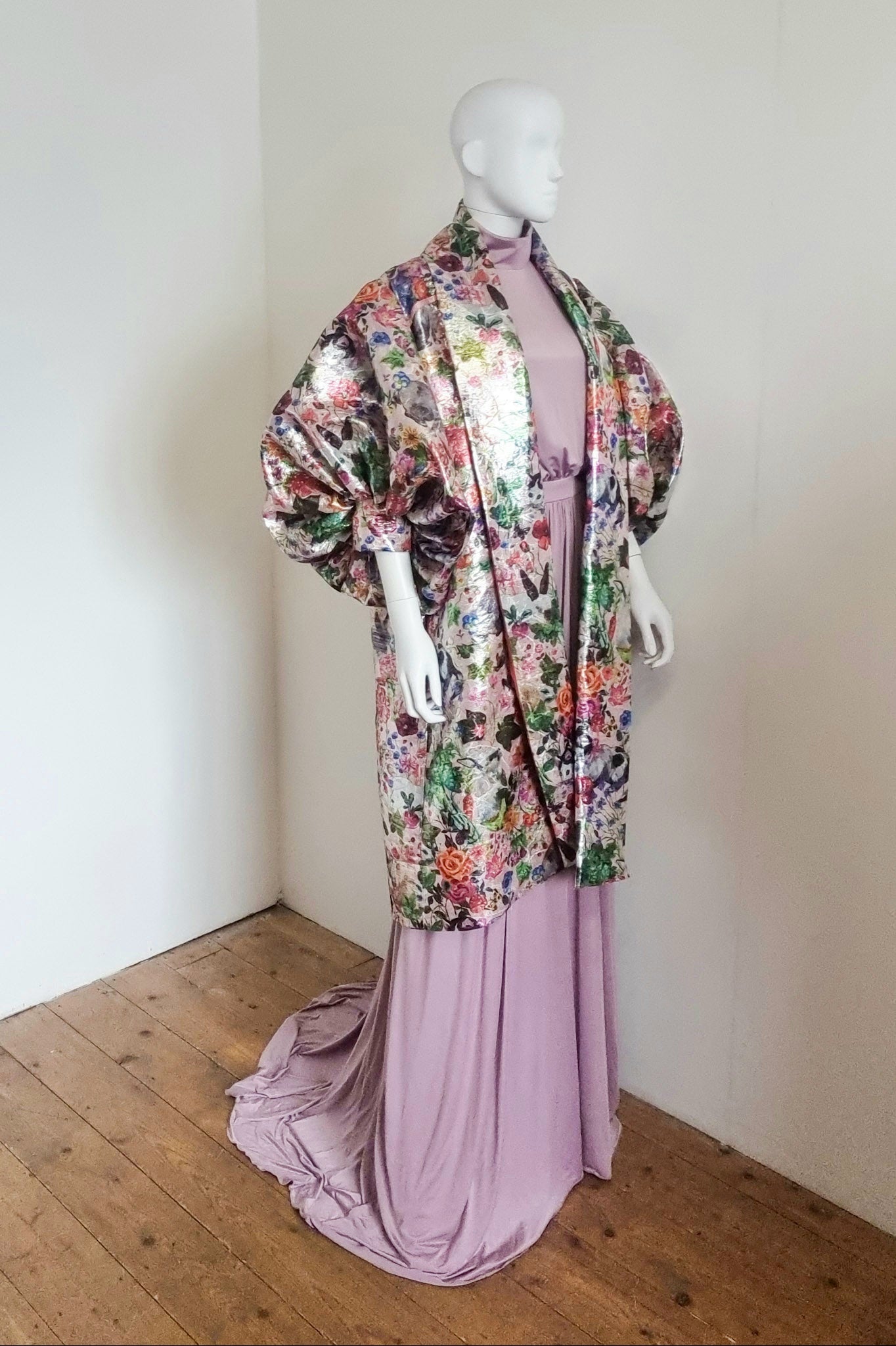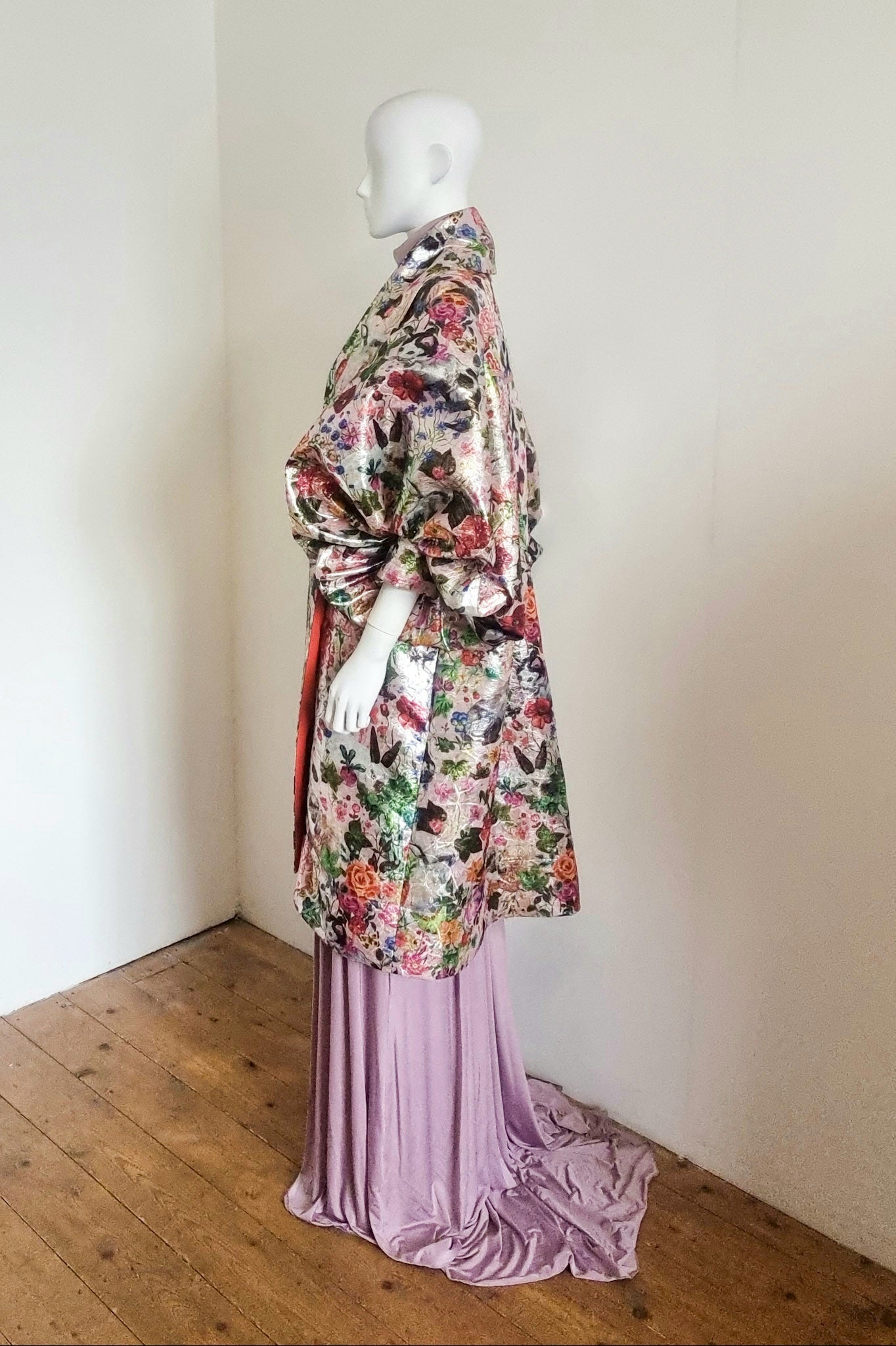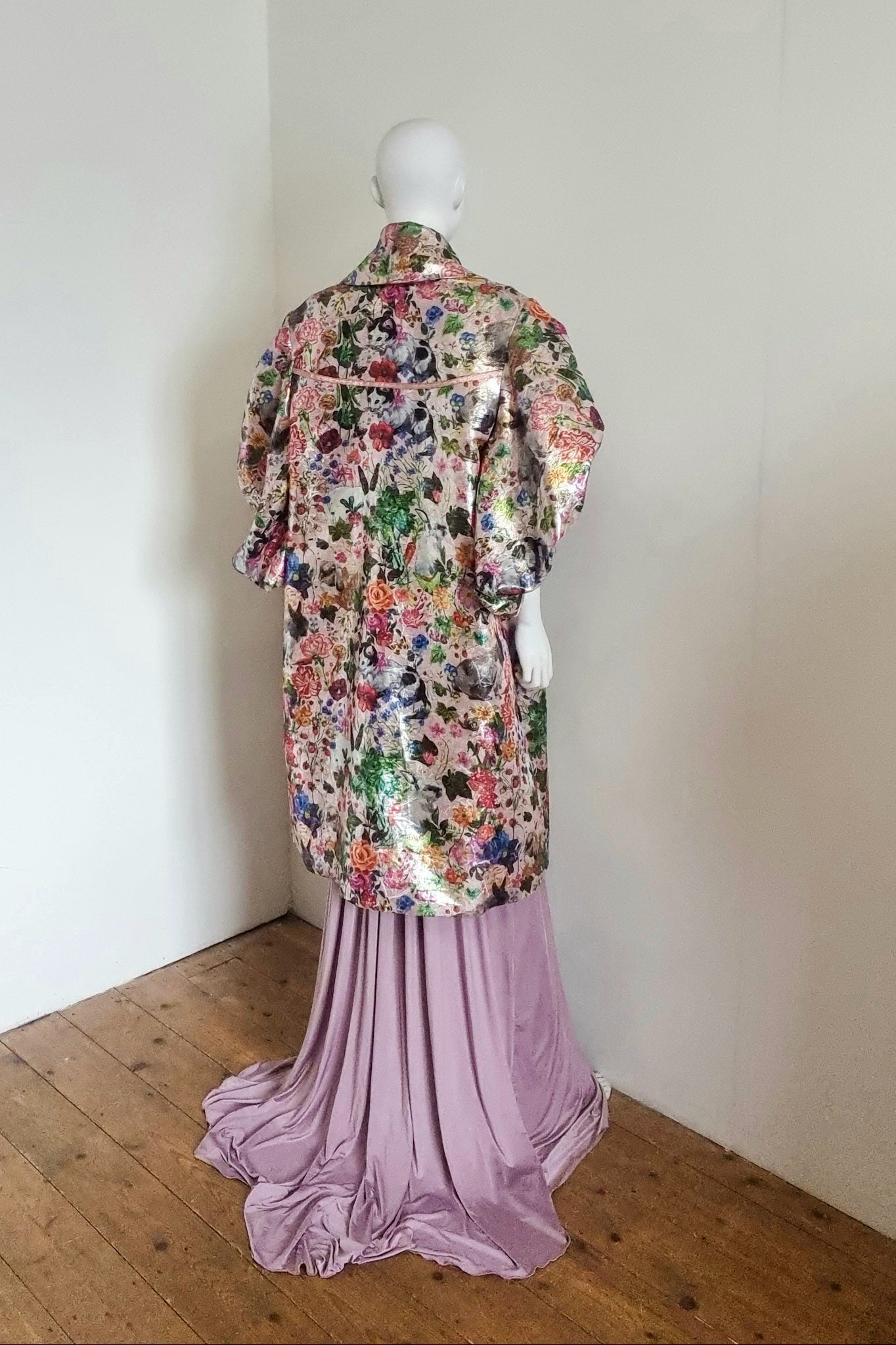 Fabric: One or our suppliers metallic cat, rabbit, mushroom, floral print brocades, it's epic! Lined in a slinky pink satin and the under collar has a bold orange contrast (polyester)