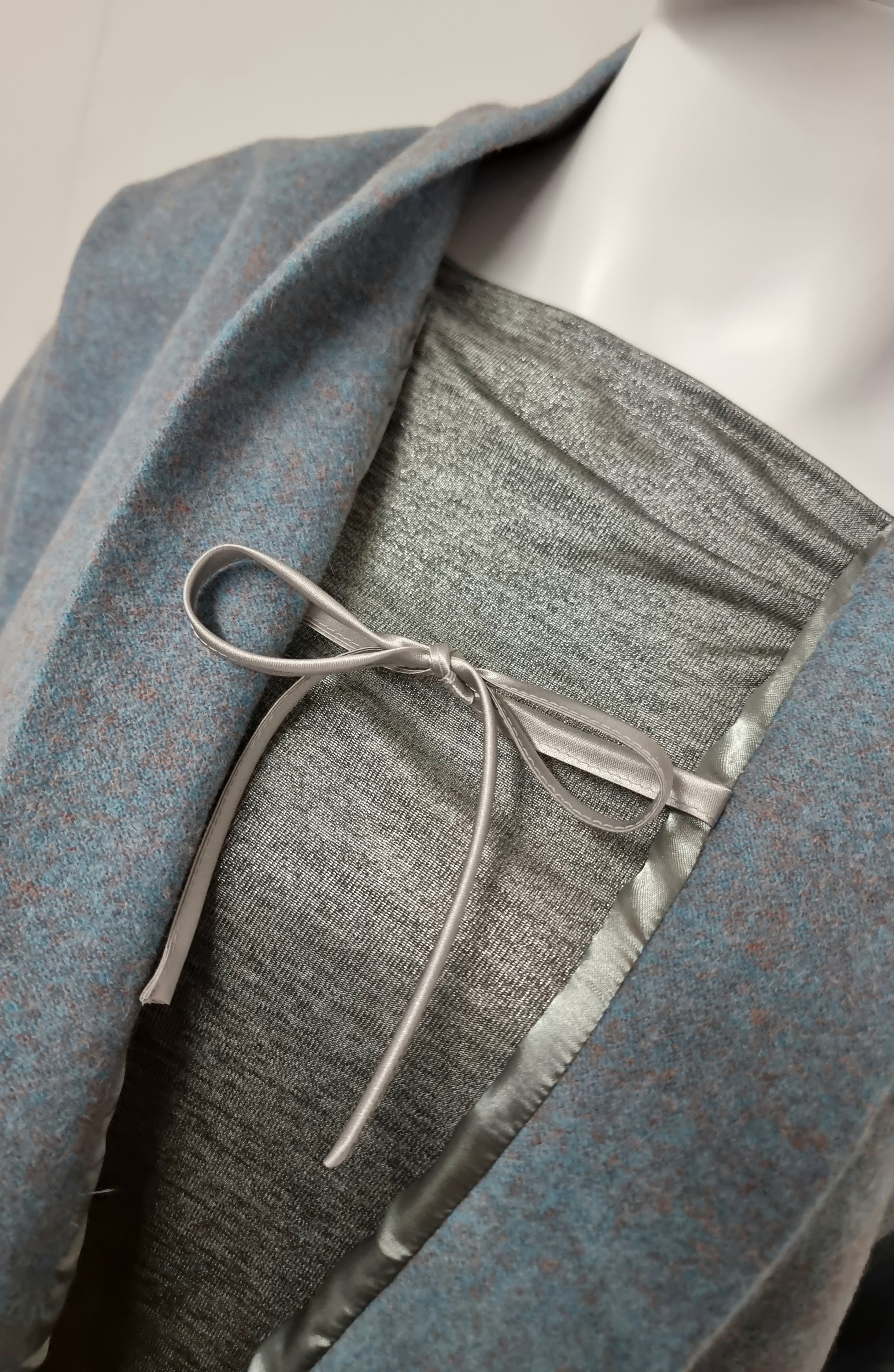 Trims: This piece is fully lined and fastens with a silver coordinating tie