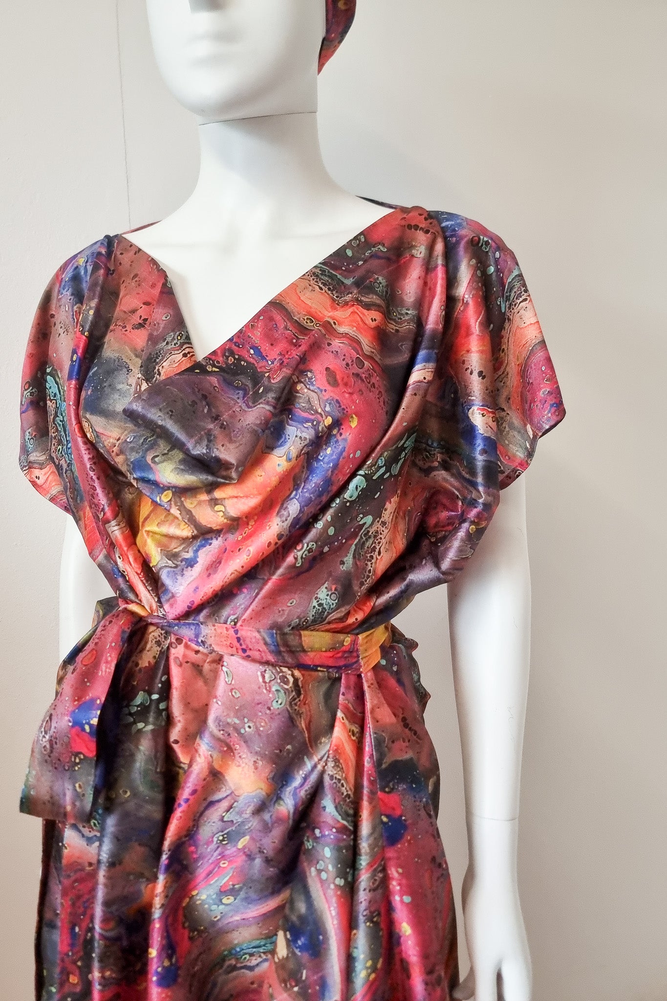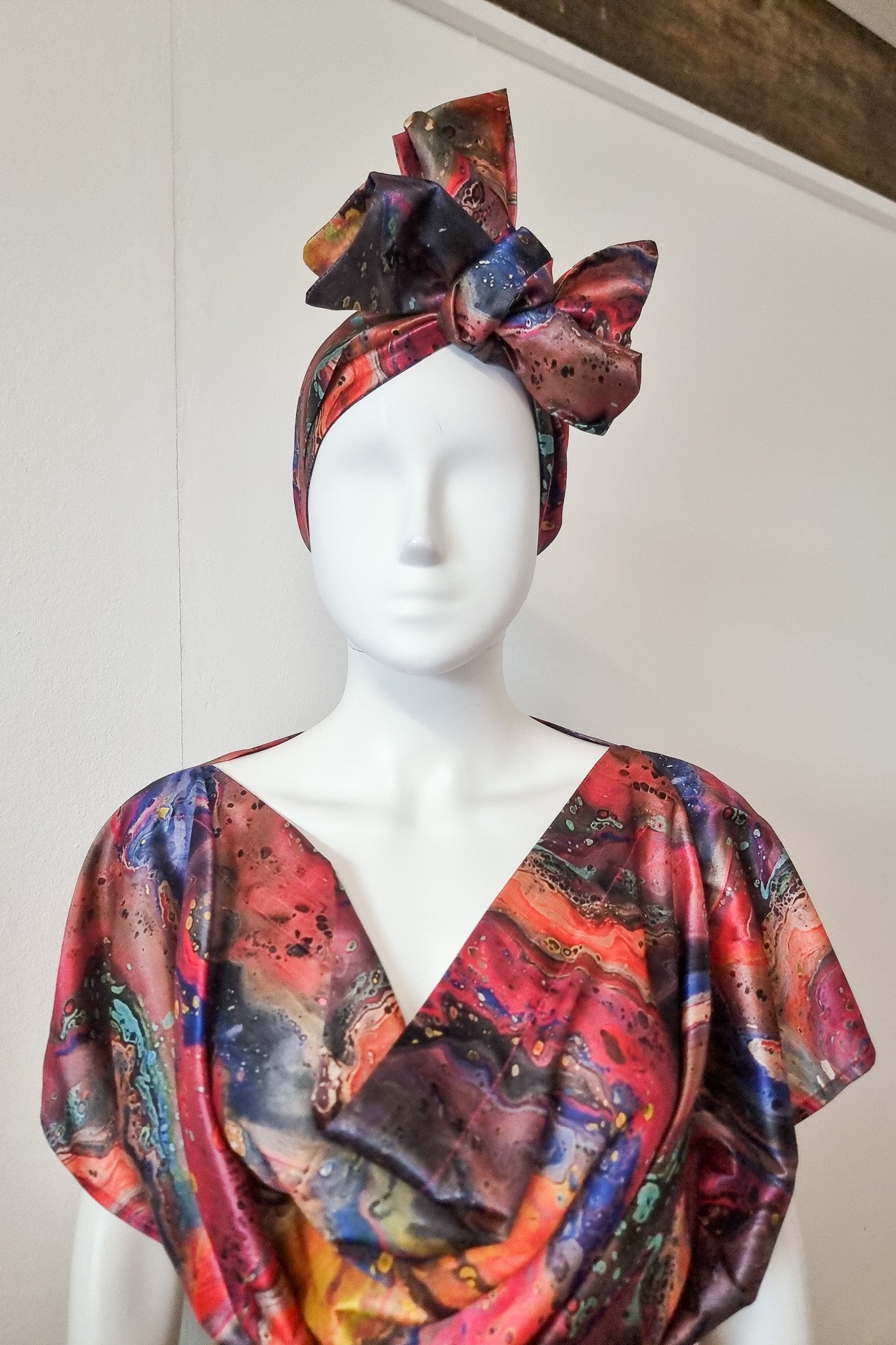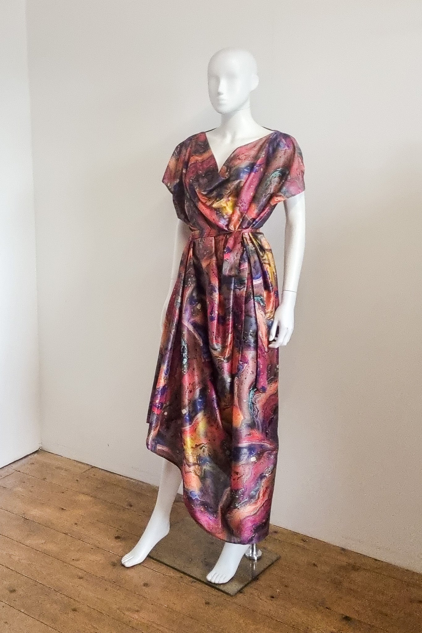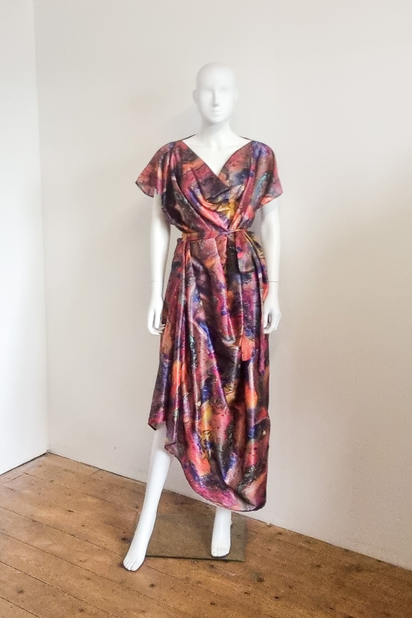This striking multi-coloured oil slick print truly comes to life once made up—it shimmers and shifts with every movement.