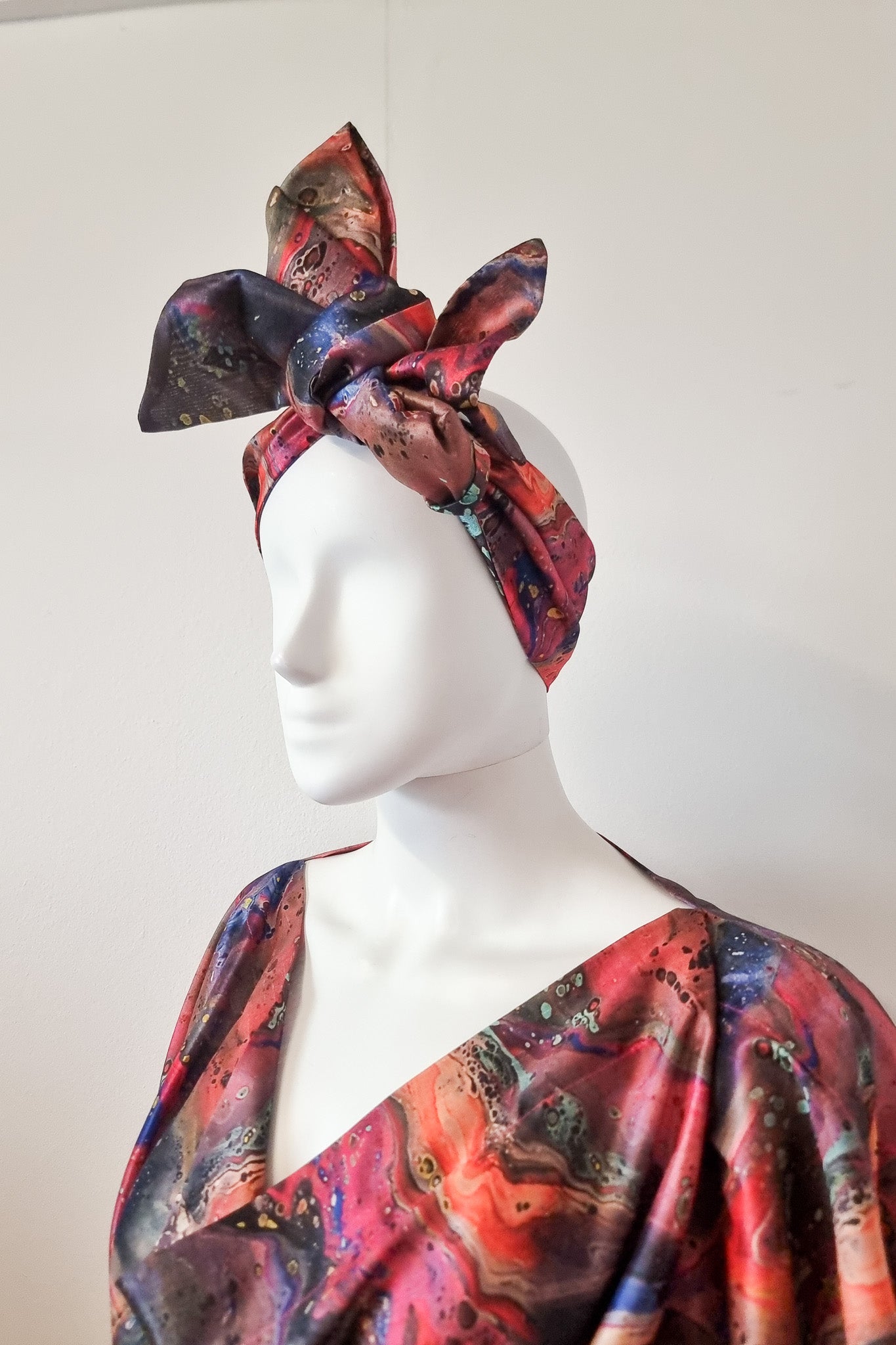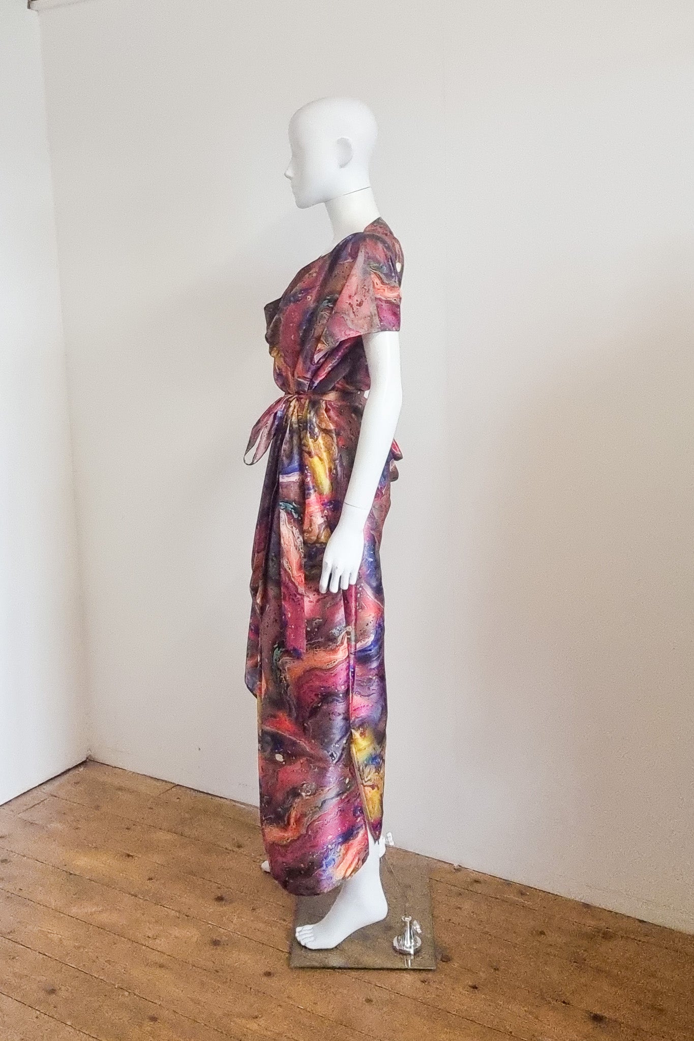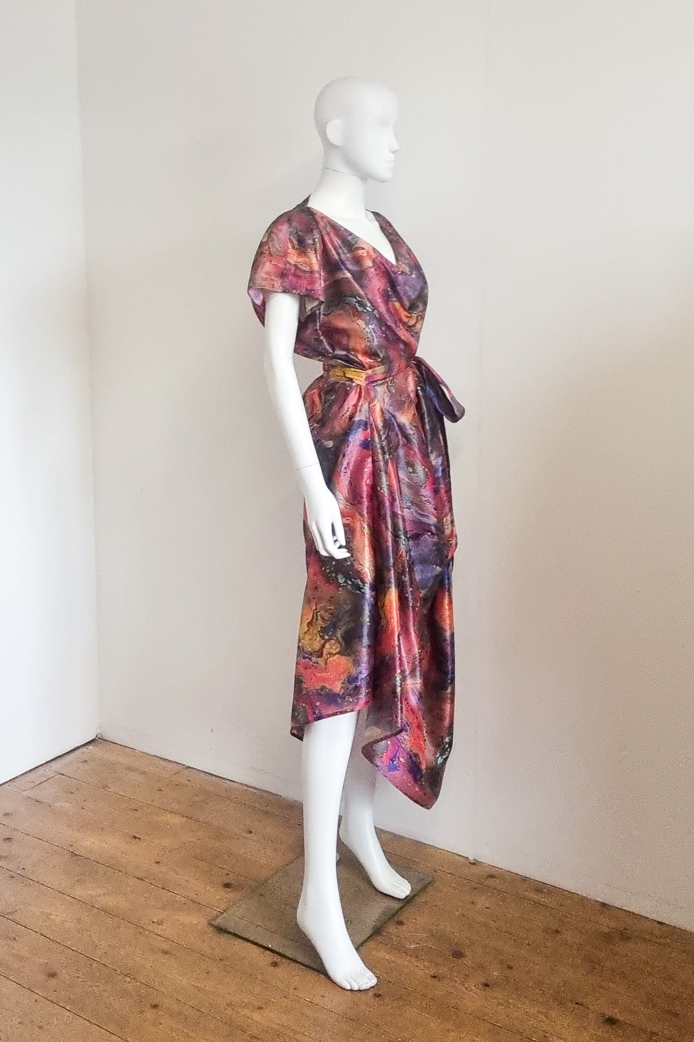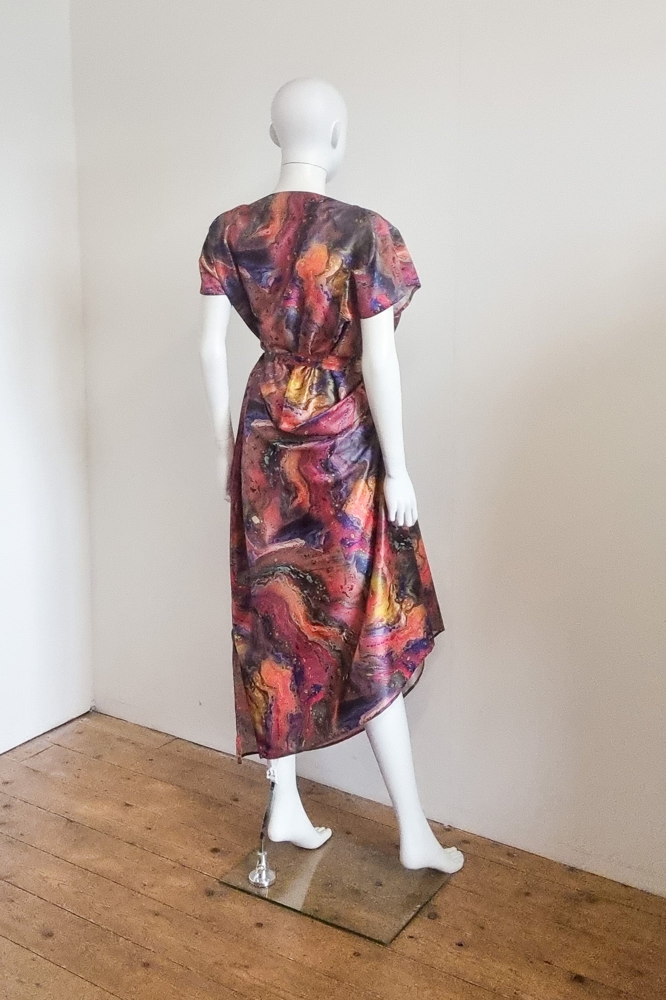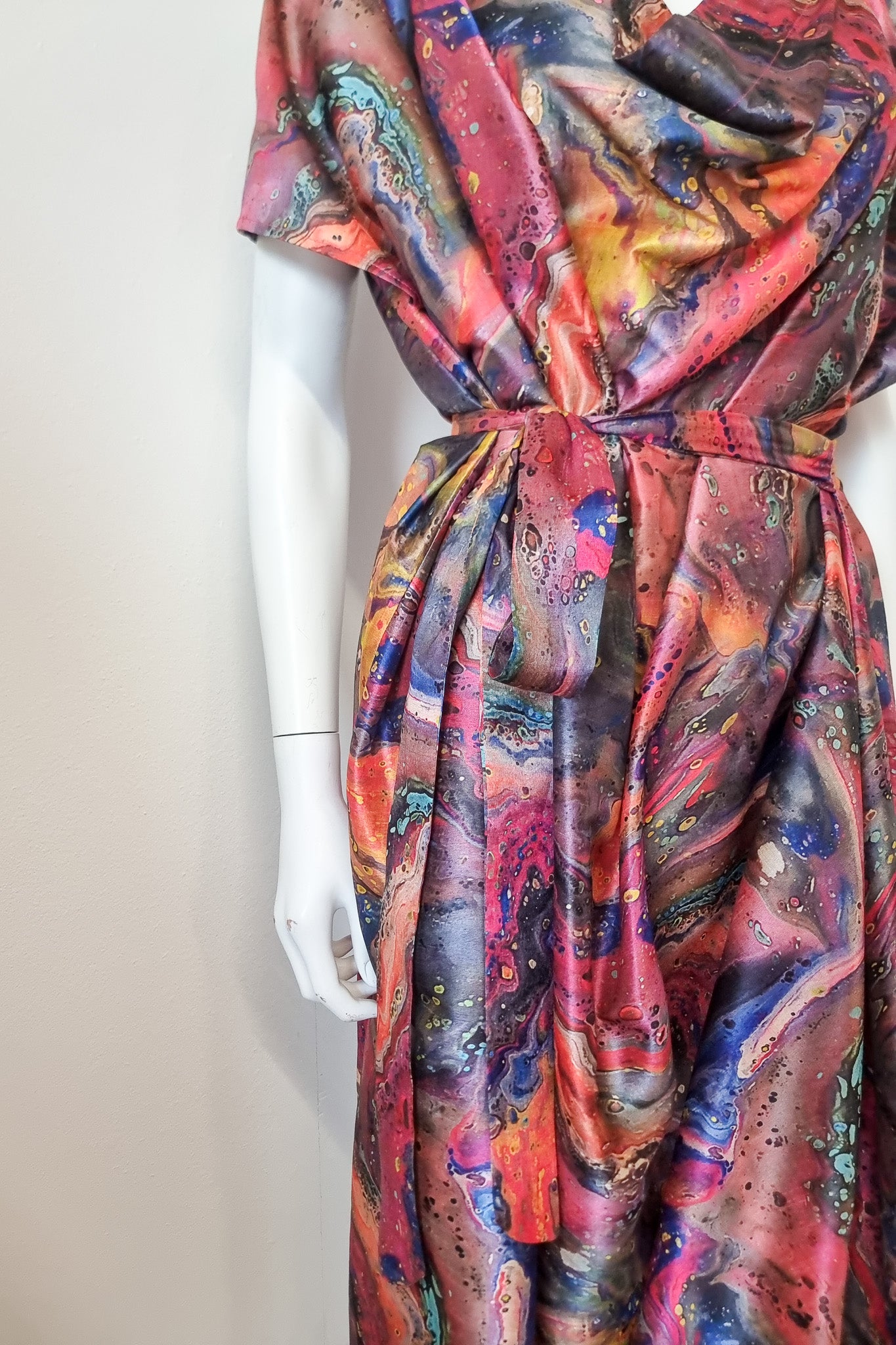 This striking multi-coloured oil slick print truly comes to life once made up—it shimmers and shifts with every movement.